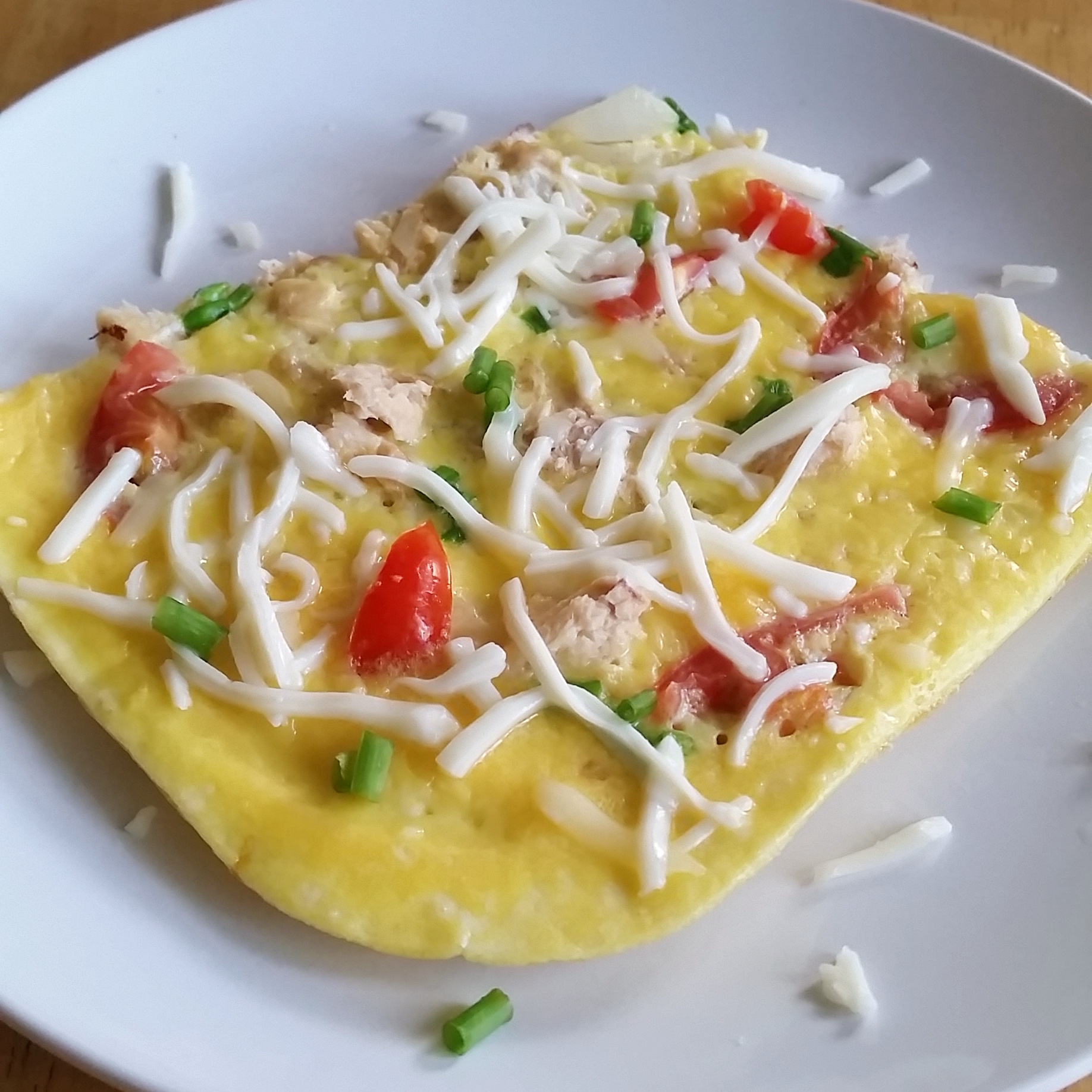 Drain salmon out of the can in a colander and run cold water over for 30 seconds. Using a spoon, press all of the water out of the salmon. Sauté chopped onions and salmon in coconut oil in saucepan on medium heat. Beat 4 eggs with a splash or milk or water and add to the salmon and onion sauté. Sprinkle tomatoes and 1 sprig of chopped chives on the eggs. Turn the stove to medium low heat and cover the saucepan for 7mins. Check for doneness and then serve!