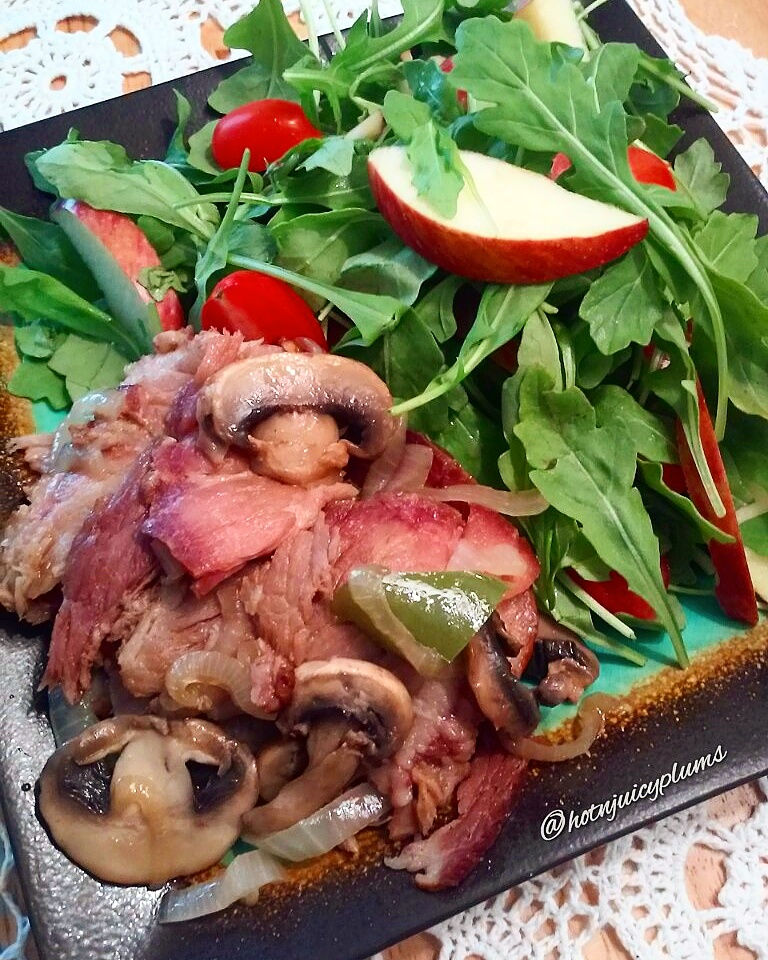 Beef brisket salad! Brisket sautéed with onions and mushrooms with arugula, apples, cranberries and grape tomatoes with a bit of rice vinegar!