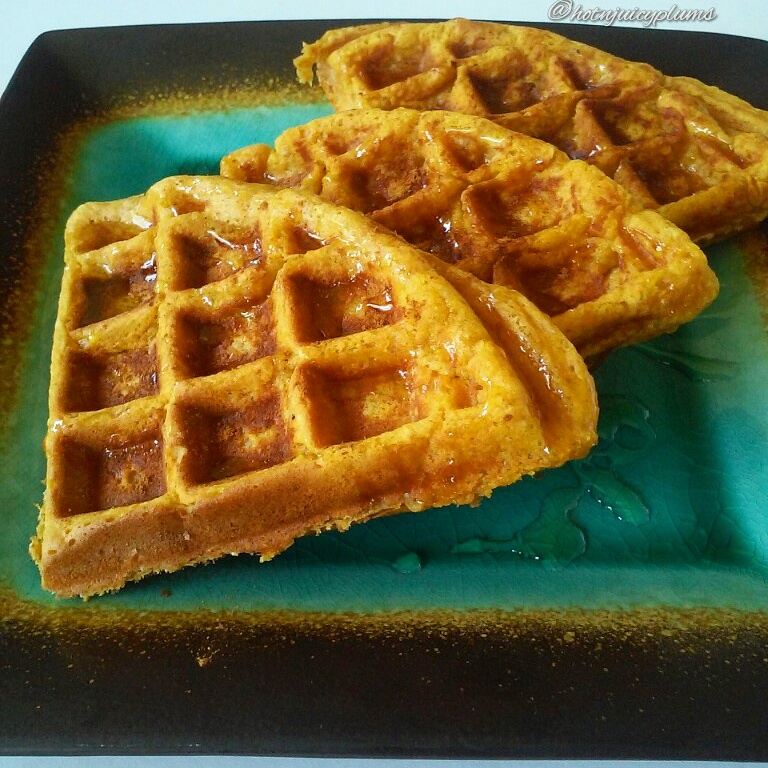 Feasting on these lovely Spiced Pumpkin Waffles with a drizzle of agave nectar this morning 😋
