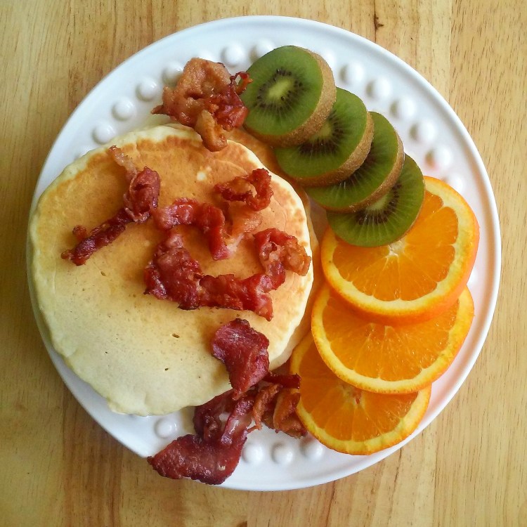 Needed a big girl breakfast this morning!! Pancakes, bacon and fruit! Pass the syrup! Good morning .
