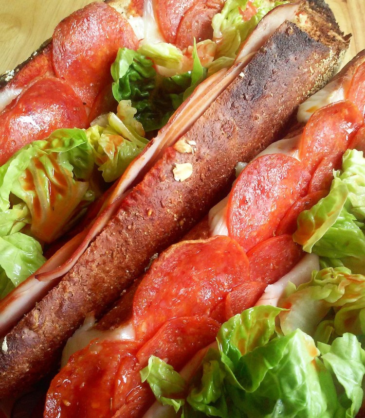 How about some pepperoni porn tonight…lol sorry! Getting downright dirty with this pepperoni, ham, turkey and cheese toasted sub. Lettuce for good measure and it’s honey oat bread!!