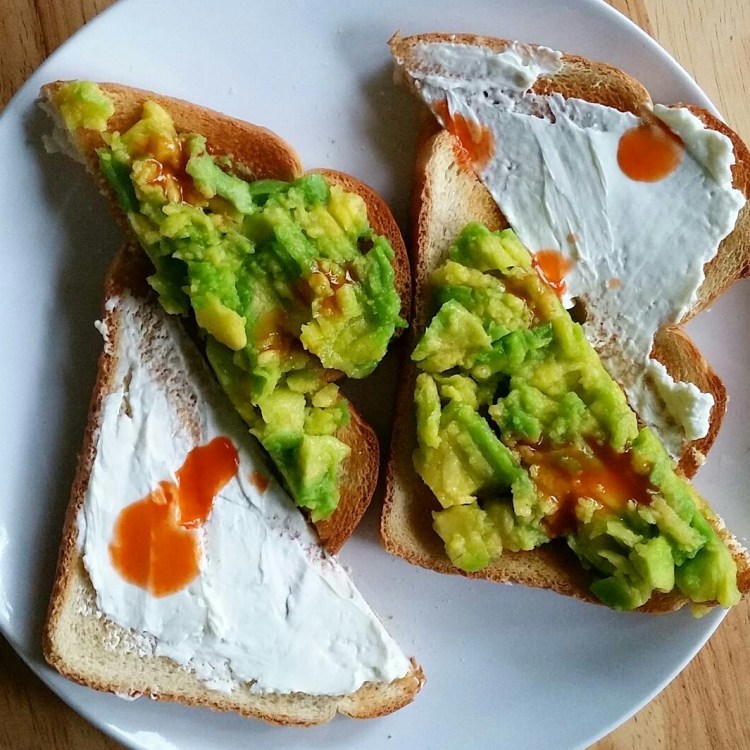 Simple but so delicious…toast, avocado and cream cheese with some hot sauce.