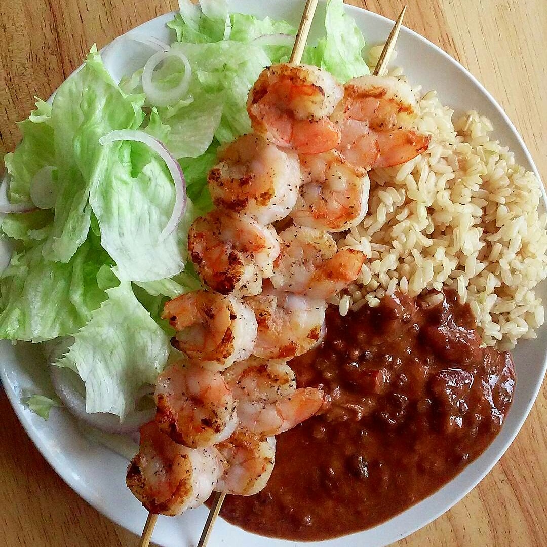On the table tonight – Grilled #shrimp, fresh salad, brown rice and #madras lentils which is a medley of lentils, red beans and Indian #spices in tomato sauce 🙂 …dinner is served