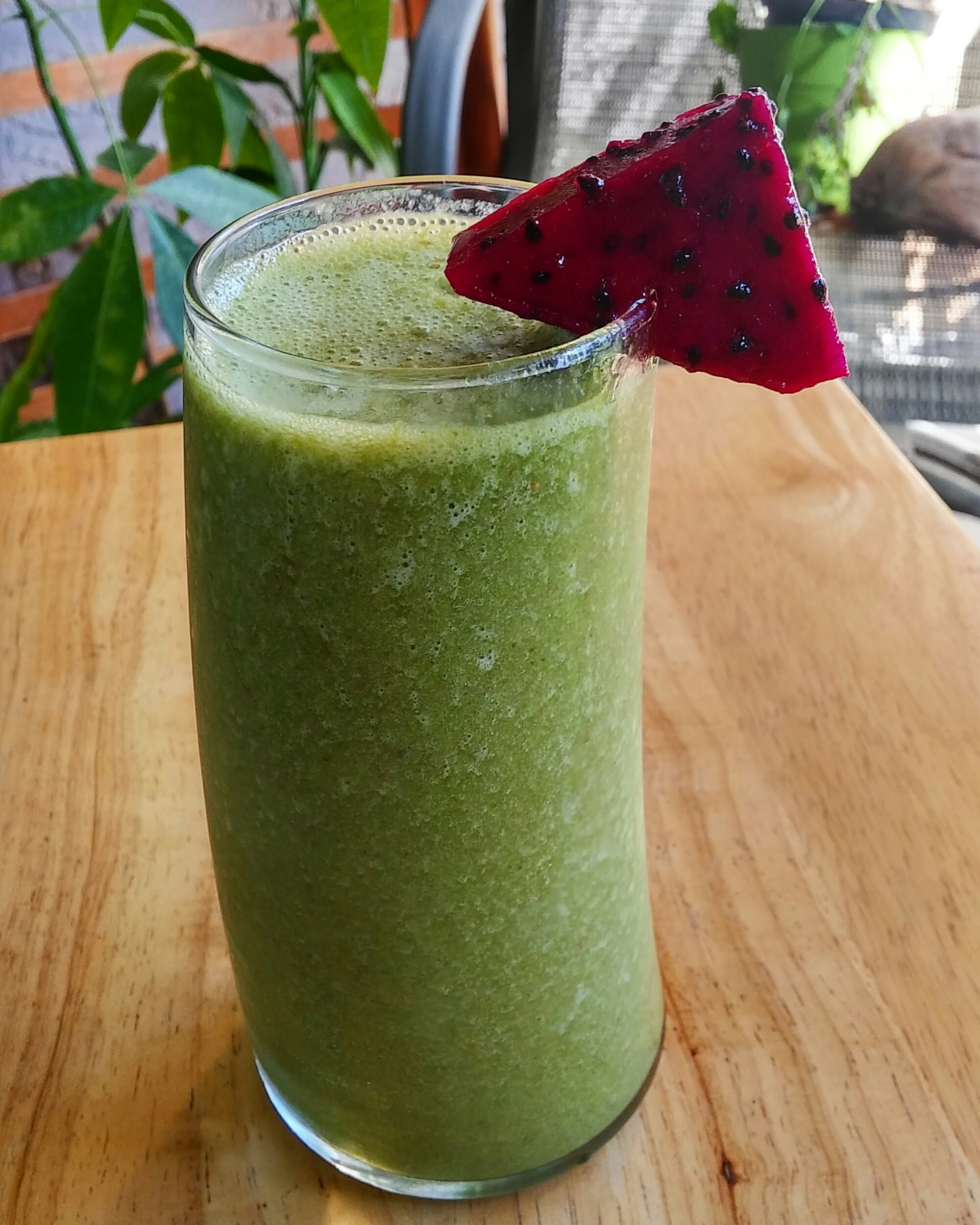 Starting #MotivationMonday with a coconut, 🍌, strawberry, spinach with a yummy slice of #dragonfruit for nibbling…morning!!