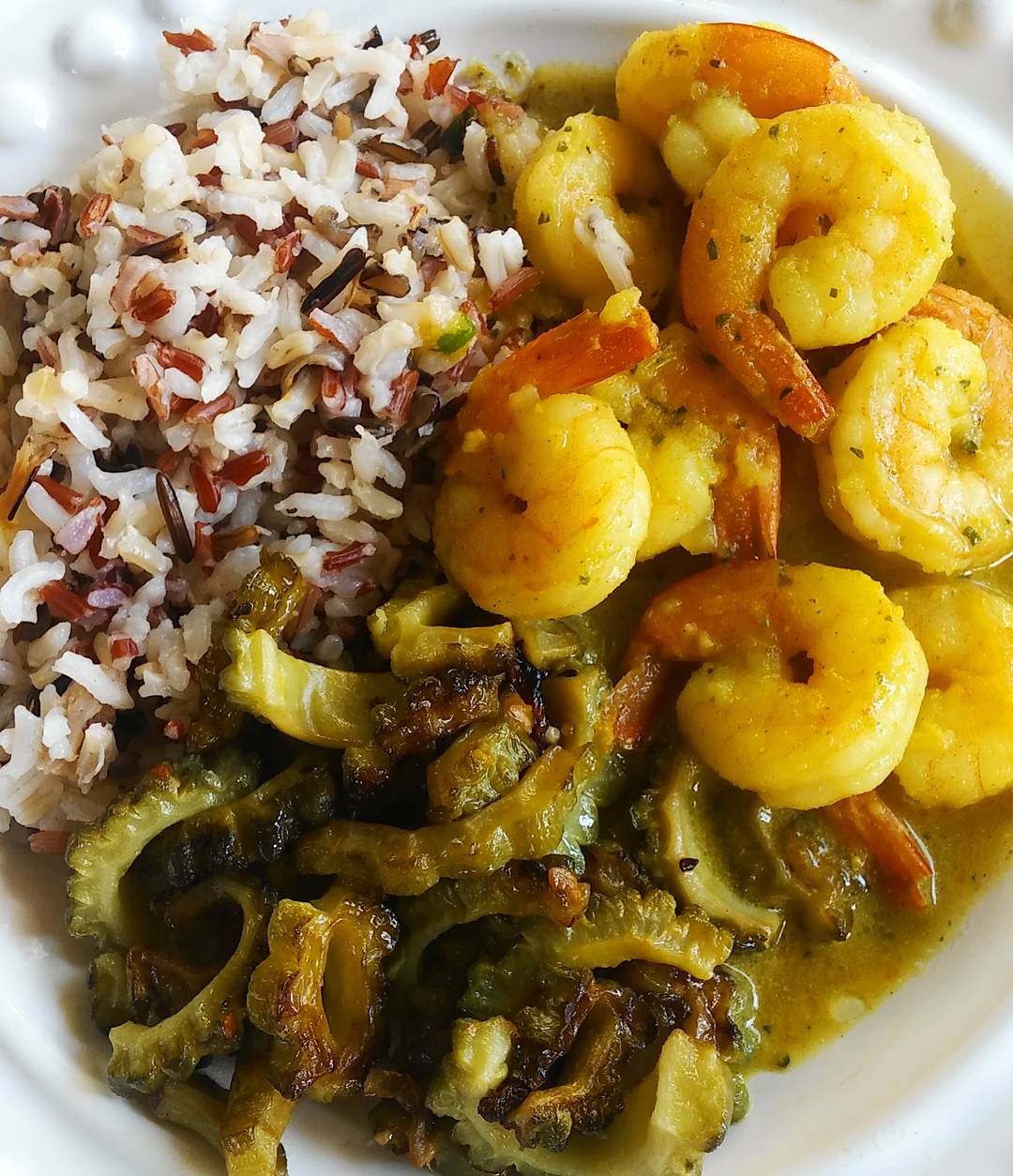 On the table this evening- shrimp in a coconut curry, a blend of #basmati, brown, red and wild rice and #bittergourd…it’s Sunday ππ