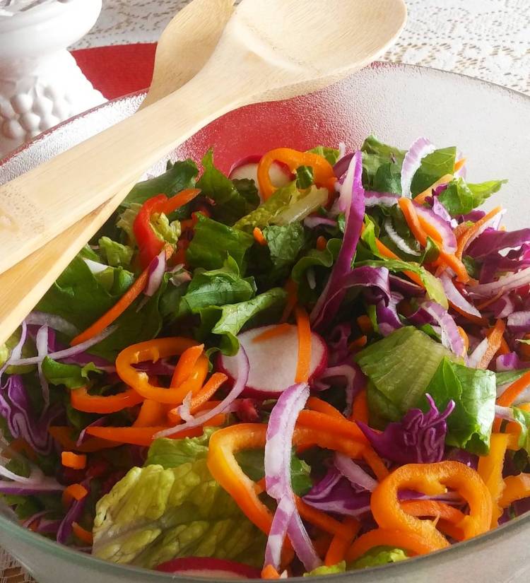 Felt like a huge salad today ๐ so here it is…. peppers, carrots, cabbage, lettuce, radishes, onions and pomegranate seeds. .